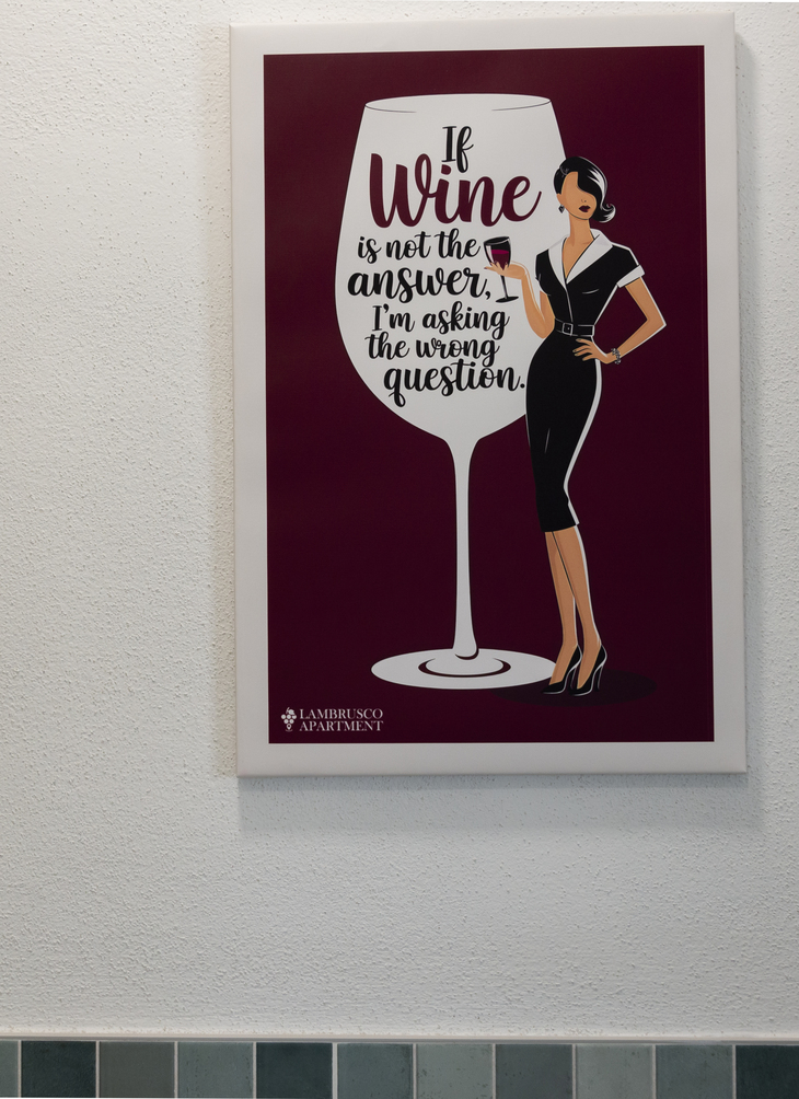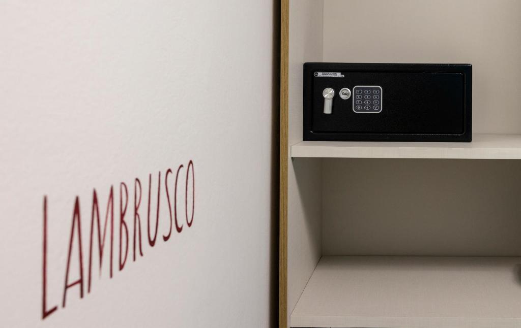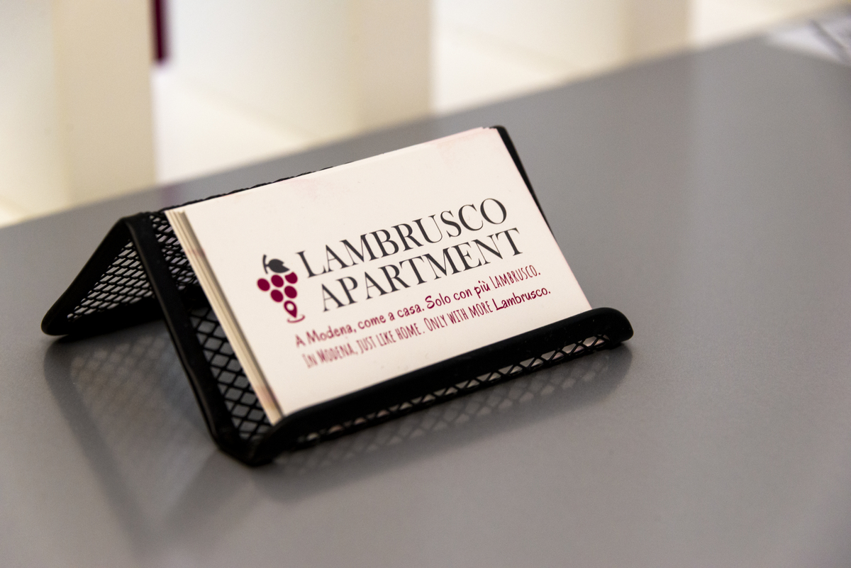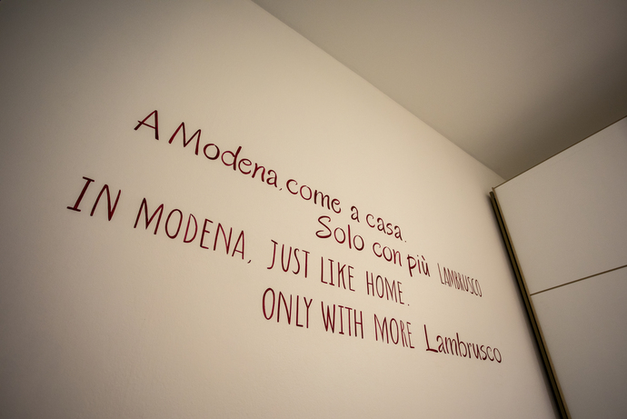 Il filo conduttore è il territorio: tutto è ispirato al Lambrusco e al vino, dalla decorazione murale con la scritta “A Modena, come a casa. Solo con più Lambrusco!” fino ai dettagli che raccontano l’anima enogastronomica della città.